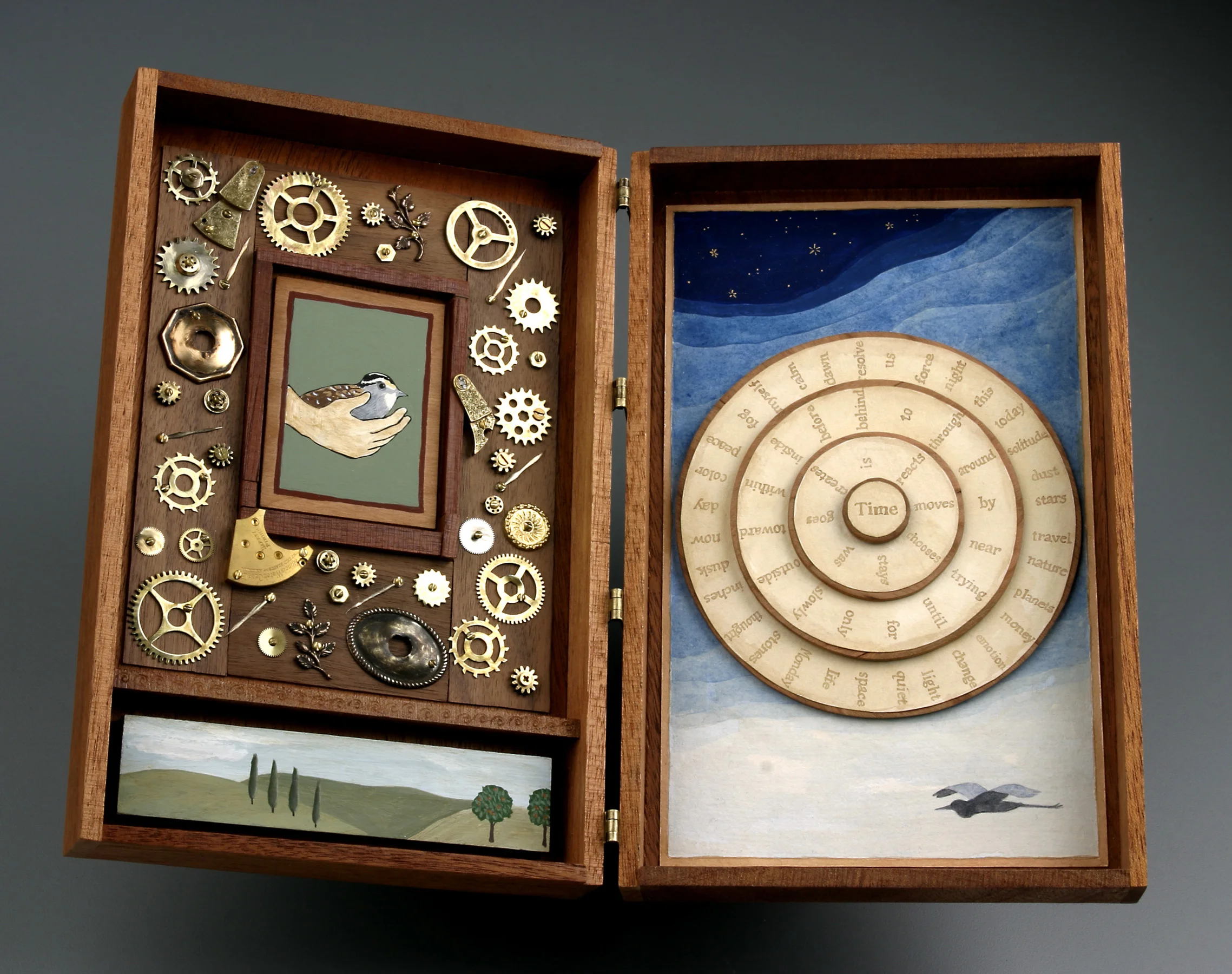 Thus unique book object is housed in mahogany box. The cover holds a brass clock part. Inside there is a small painting illuminated by watch parts and other odds and ends. The small prudella is a nod to Sienese landscape paintings. The facing page holds volvelles with words, which when interacted with, produce poetry about time.